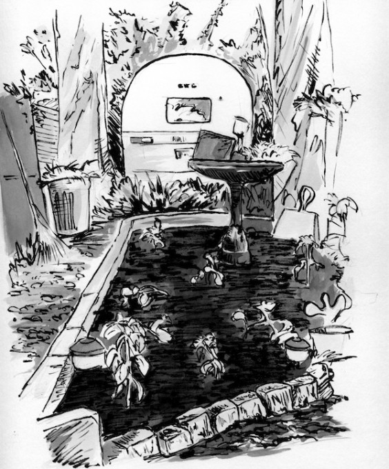 I got up and made what we thought was the last of the coffee but I think there’s enough for Rob’s coffee later as well. I did the morning routine. I started the monumental task of tidying my desk; I’m already anxious in advance of travel though I know I’ll be elated to be in Houston once I’m there. I corresponded and attempted to respond to all the amazing love and felicitations coming my way from Facebook. It’s like a birthday only more substantive; it makes me feel crazy and happy! I realized if I left the house a little early I could stop at SuperKing and do some sorely-needed grocery shopping. I did the fastest shop I could muster and then drove through trafficky streets to Aurora’s where I picked up the camping gear we’d lent to Andrew for his trip to Joshua Tree. I drove into Boyle Heights, to the city-run free mulch pile and filled the bed of Rob’s truck with what I hoped was enough mulch for the parking strip between our sidewalk and the street. Sonal texted that she’d be late picking up the camping gear to borrow for her and K.’s trip to Utah so I stopped at Antigua on the way home to buy more coffee beans. I got home and started breaking down cardboard boxes for the mulching. Sonal arrived and I loaned her gear. I continued laying cardboard and mulch; I had exactly enough mulch, as it turned out. I finished just in time to meet Hana at Sunset Nursery in Silverlake. She helped me choose vegetables to buy: two kinds of chile, three kinds of heirloom tomato, a round yellow cucumber called apple cucumber, and three different kinds of kale (of course!). We drove home and had spinach soup and kale-cabbage-jícama salad on the front porch—the first time Hana had seen it since she lived in the trailer last summer. We aerated the soil in the bed by the laundry shed, added compost (an incredibly pleasing transformation) and planted most of the kale. Hana left and I kept on working—figured I’d do it today or never, and anyway need to plant now if I want to enjoy